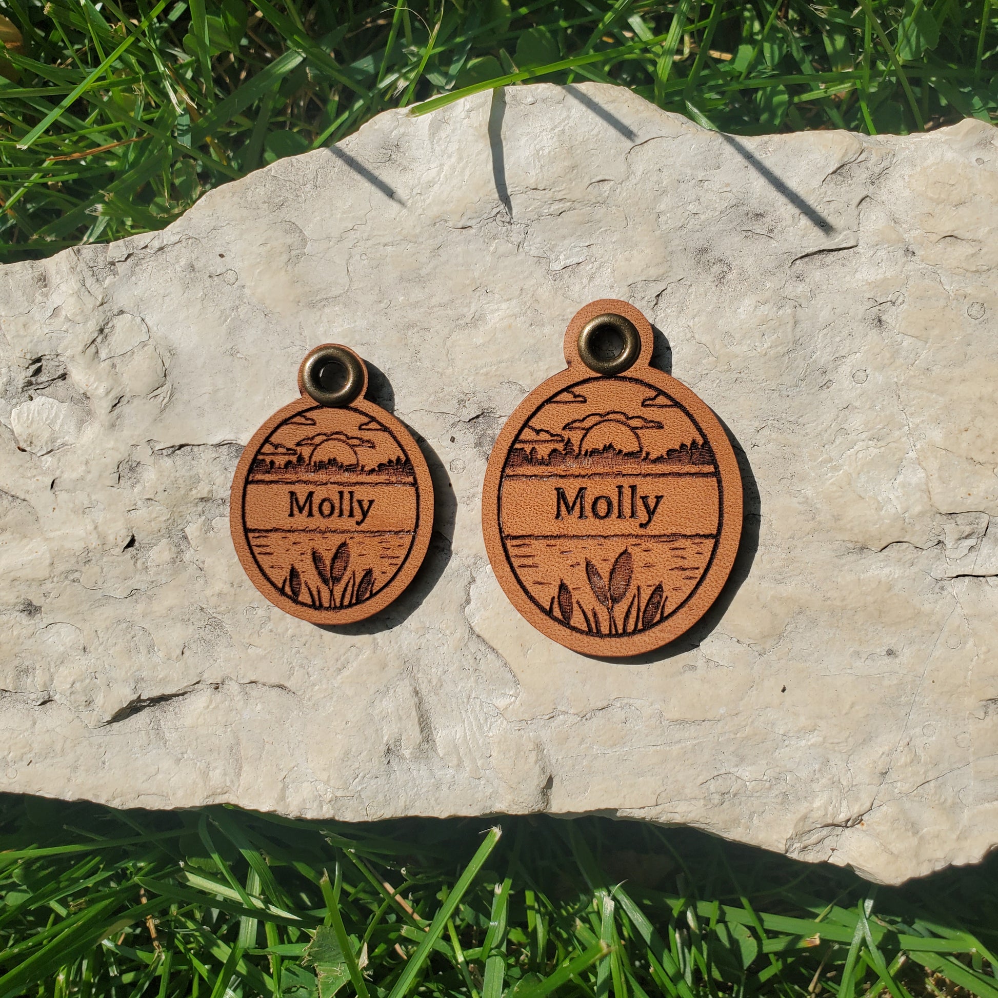 These leather pet tags are a great “silent tag” alternative. They are all designed by me and can be engraved on both the front and back.