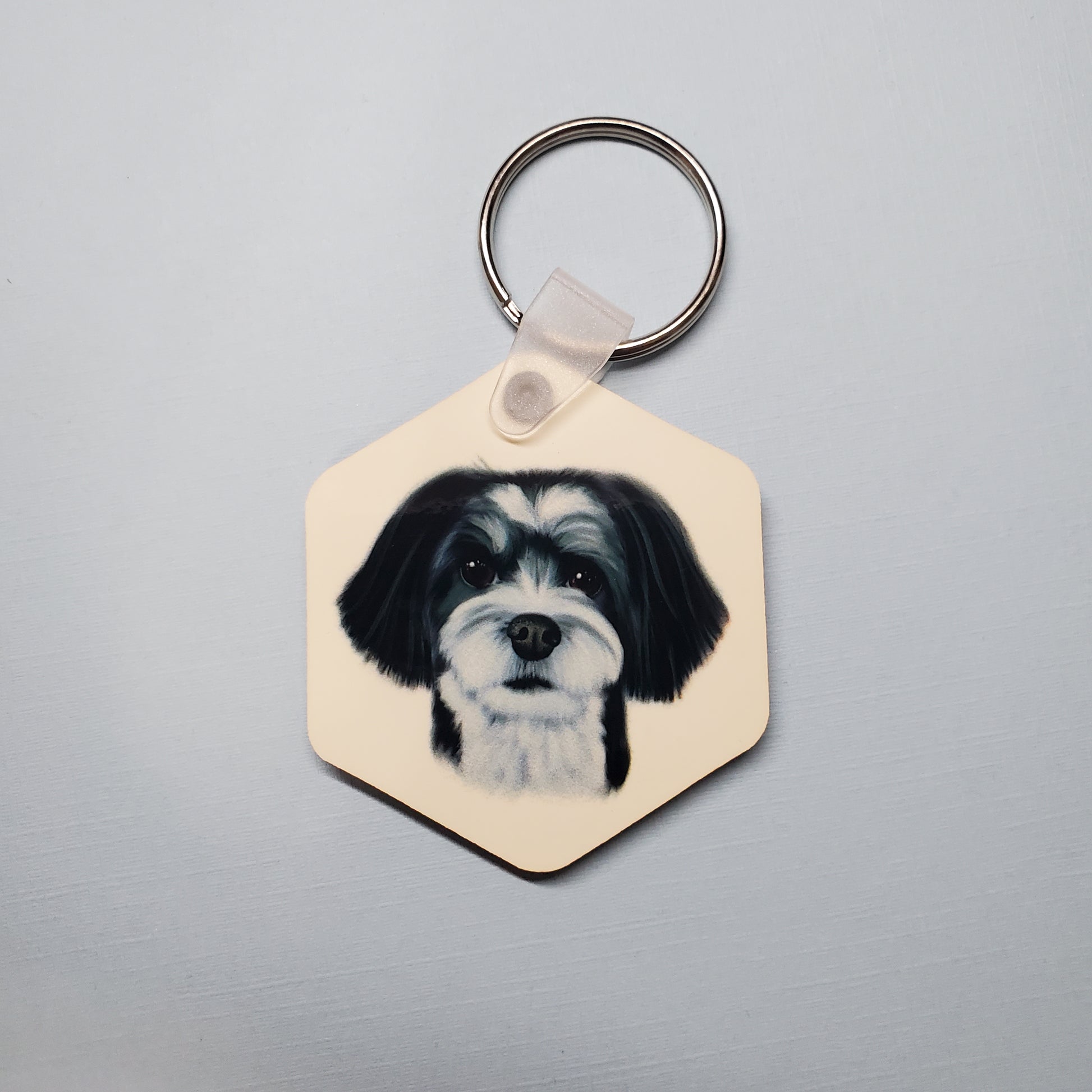 Keep your beloved furry ones close to you at all times with a custom keychain. I create hand drawn portraits of your pet and print them onto a double sided keychain.
